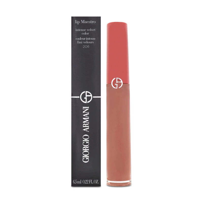 The Giorgio Armani Lip Maestro Intense Velvet Nude Lipstick 206 in Cedar is designed to deliver rich, seductive pigments for a captivating look that lasts.
