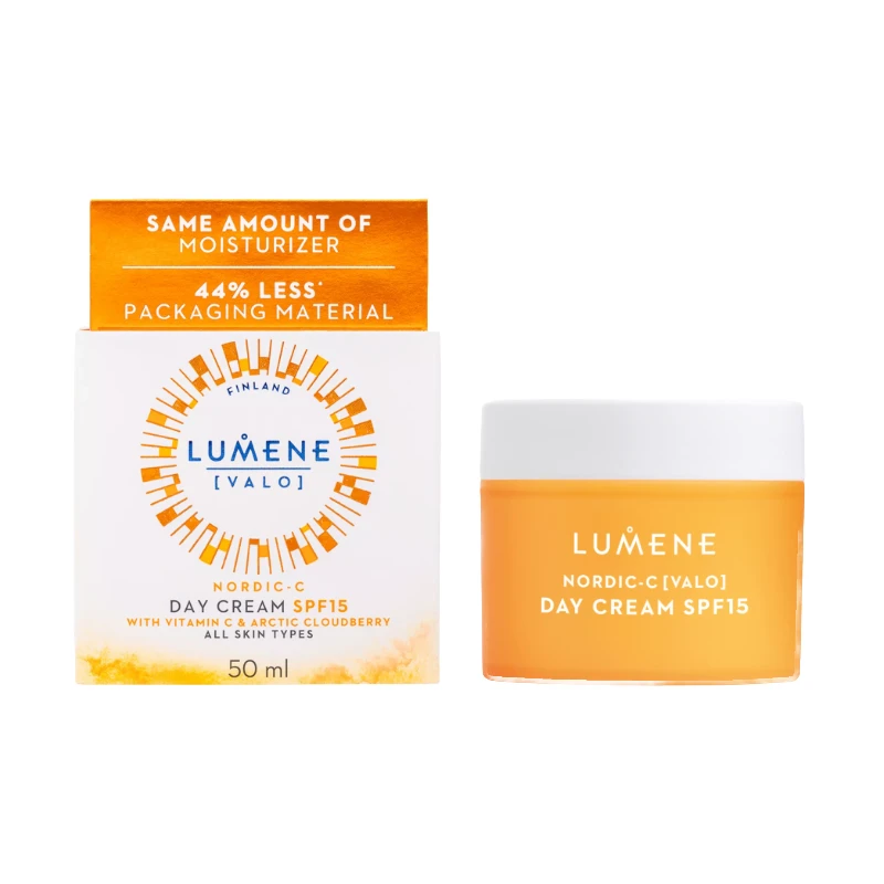 Unveil the glow of your skin with the Lumene Nordic-C [Valo] Day Cream SPF 15, 50ml. This refreshing day cream hydrates, brightens, and shields your skin from harmful UVA/UVB rays. Its antioxidant-rich formula, featuring Arctic cloudberry and vitamins C, B5, and E, nourishes and revitalises for naturally radiant skin.